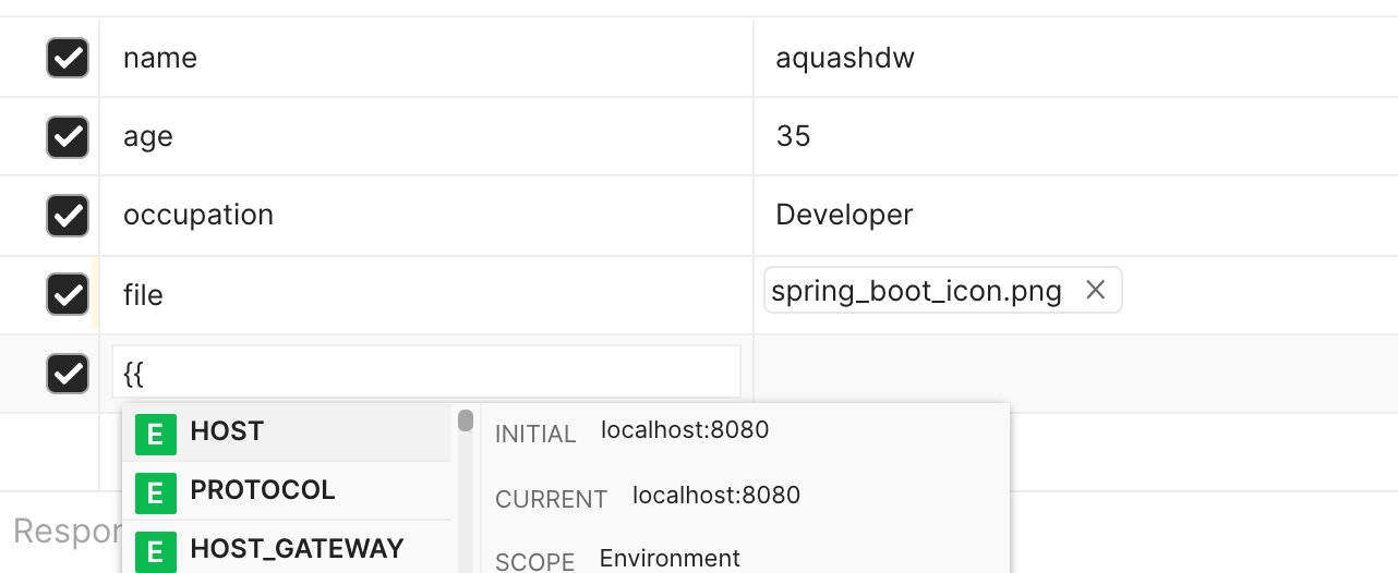 마지막으로 Environment를 살펴보면, Postman에서는 사용자 입력을 받는 대부분의 위치에 {{변수명}} 를 이용해 미리 저장된 값을 가져올 수 있습니다. Body의 몇몇 상황을 제외하고는 대부분 사용 가능합니다.