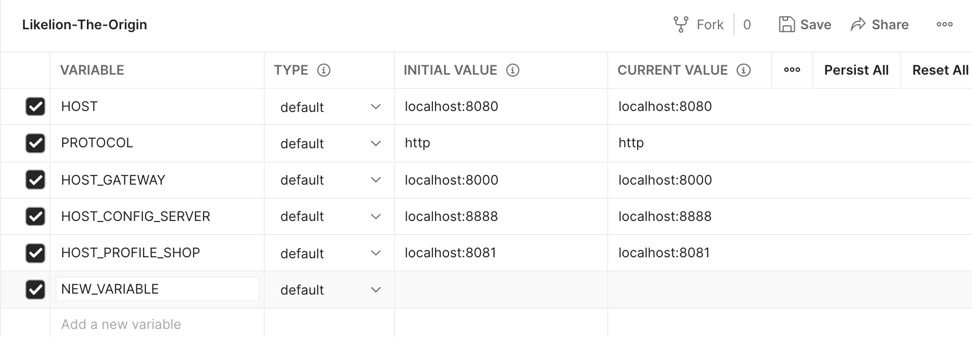 내용을 보면 다양한 변수에 할당된 기본값, 임시로 할당해놓은 값들을 확인해볼 수 있습니다. 임시로 할당한 값은 Reset All 을 선택하면 INITIAL VALUE 의 값으로 CURRENT VALUE 가 설정되며, Persist All 을 선택하면 CURRENT VALUE 가 INITIAL VALUE 로 설정됩니다.