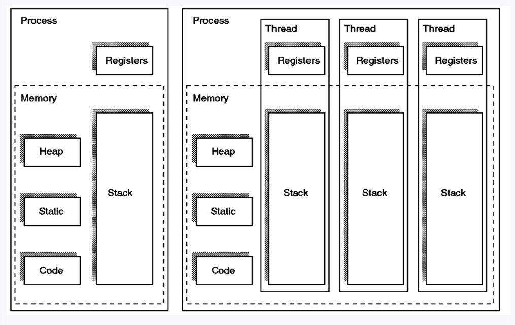 멀티 스레드 방식은 context switching 시 stack 영역에 대해서만 처리를 하면 되기 때문에 작업 부하가 멀티 프로세스에 비해 적다. 멀티 프로세스 방식은 CPU 레지스터 뿐 아니라, RAM과 CPU 사이의 캐시 메모리에 대한 데이터까지 초기화를 해야해서 오버헤드가 더 크다