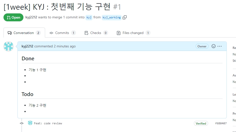1조의 코드 리뷰 스타일은 전원 공유 git 리포지터리를 통해 Pull Request Comment를 날리는 형식으로 리뷰를 진행하기로 하였습니다.