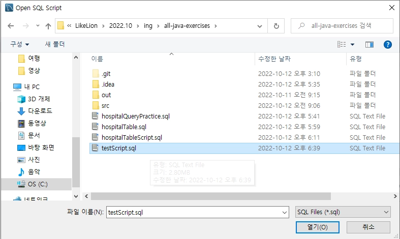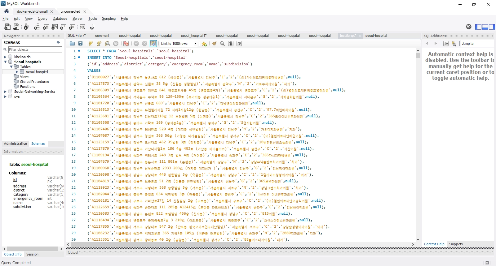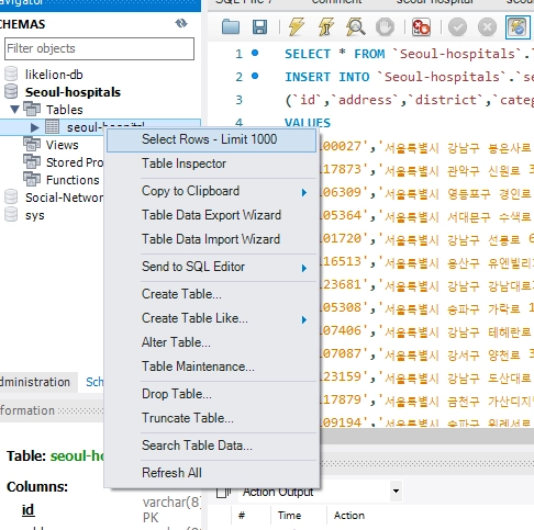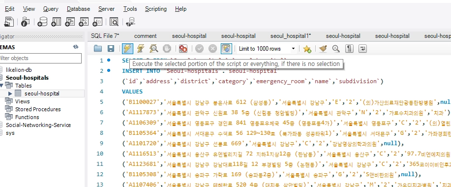 대량의 데이터를 이용해 테이블을 생성하는 쿼리를 담은 SQL 스크립트 파일을 만들 수 있어야 본격적으로 DB를 다룰 수 있게 된다. 이 실습에서는 서울시에 있는 병원에 대한 데이터를 담은 CSV 파일을 이용해 SQL 스크립트 파일을 만들어볼 것이다. 실습을 하는 순서는 아래와 같다.