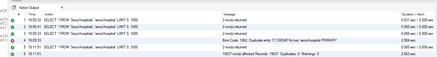 성공했다는 체크표시와 함께 총 19037개의 row가 영향을 받았음을 보여준다.