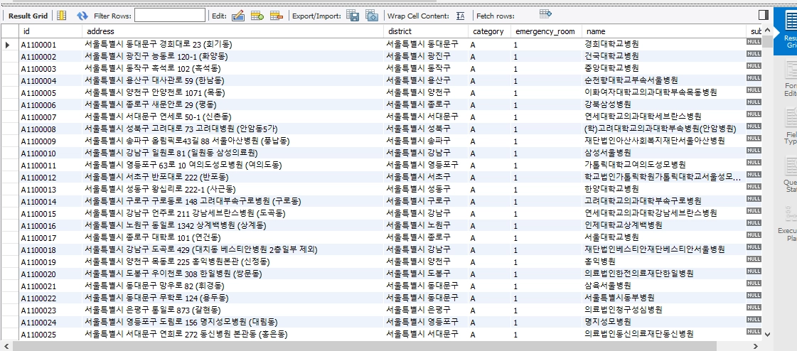 서울에도 많은 병원이 있지만, 규모를 더 크게 전국으로 늘려서 파일을 DB테이블로 옮기는 연습을 해보는 것도 도움이 될 것 같다.