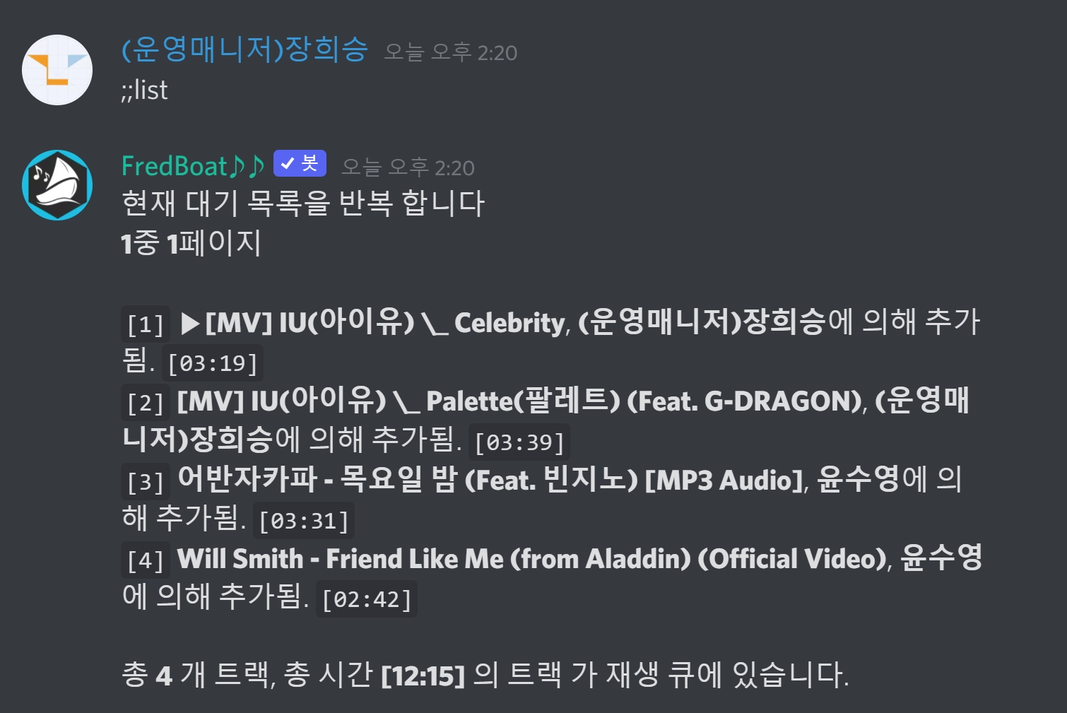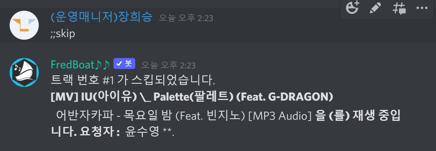 이와 같은 경우는 스터디룸-노래신청방 채널에서 재생or 노래 리스트 추가를 통해