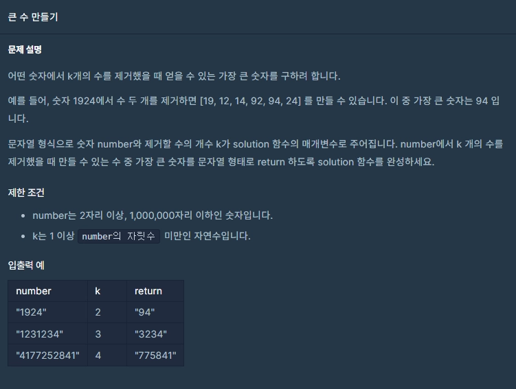 마지막으로, 스택을 활용해 만들어준 가장 큰 숫자를 문자열 형태로 return 해야 하므로 k의 개수에 따라 조건을 설정하여 문자열 형태로 표현되도록 한다.