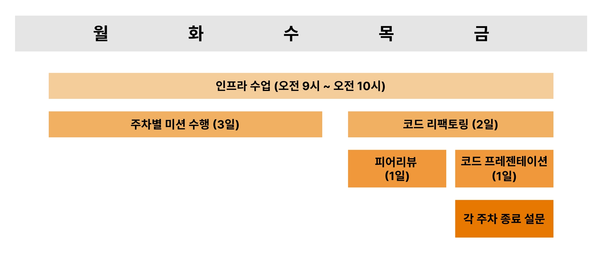 미션 수행 + 피어리뷰 + 코드 리팩토링 + 코드 프레젠테이션 네 가지 활동이 아래 위클리 타임라인에 따라 진행됩니다.