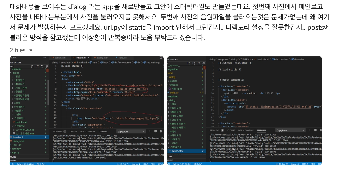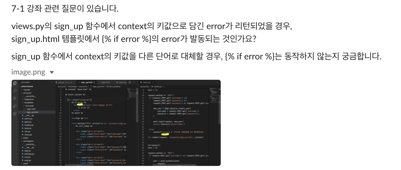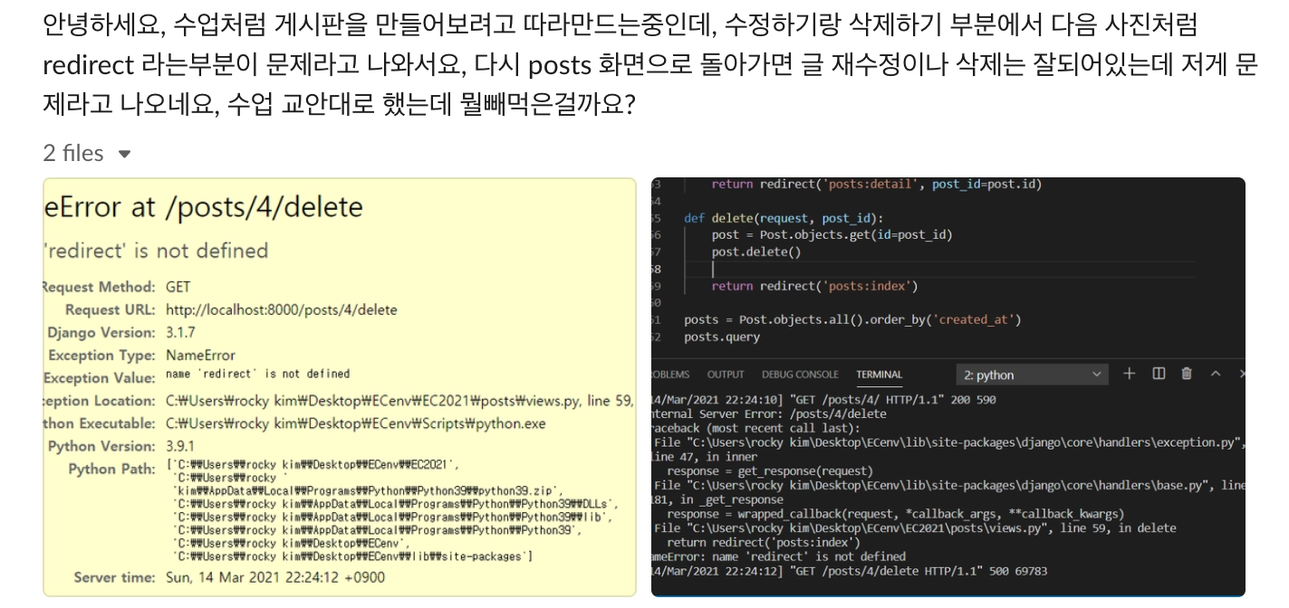 예시 에러메세지와 함께 에러가 나타난 코드를 함께 캡처하여 첨부해주세요.