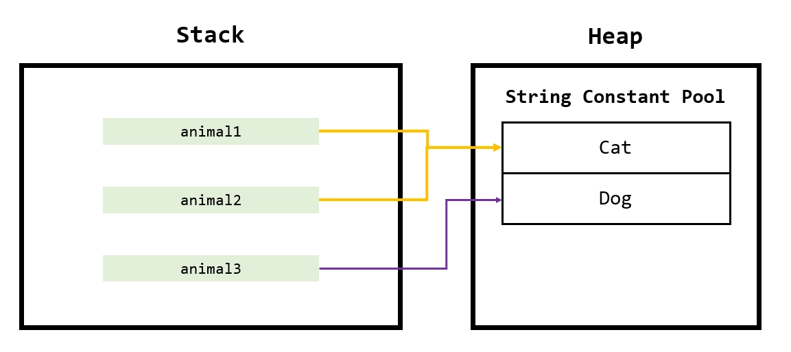 위와 같이 String을 리터럴로 할당하는 경우 animal1 , animal2 , animal3 는 Stack 영역에, "Cat" 과 "Dog" 는 Heap 영역에 저장된다.