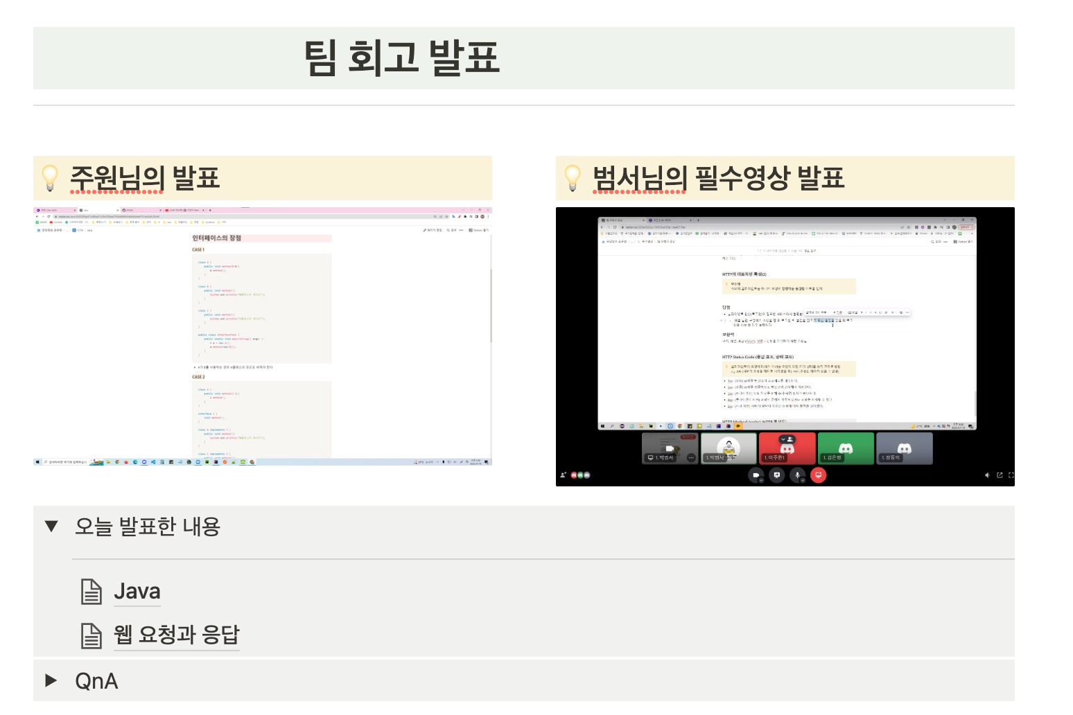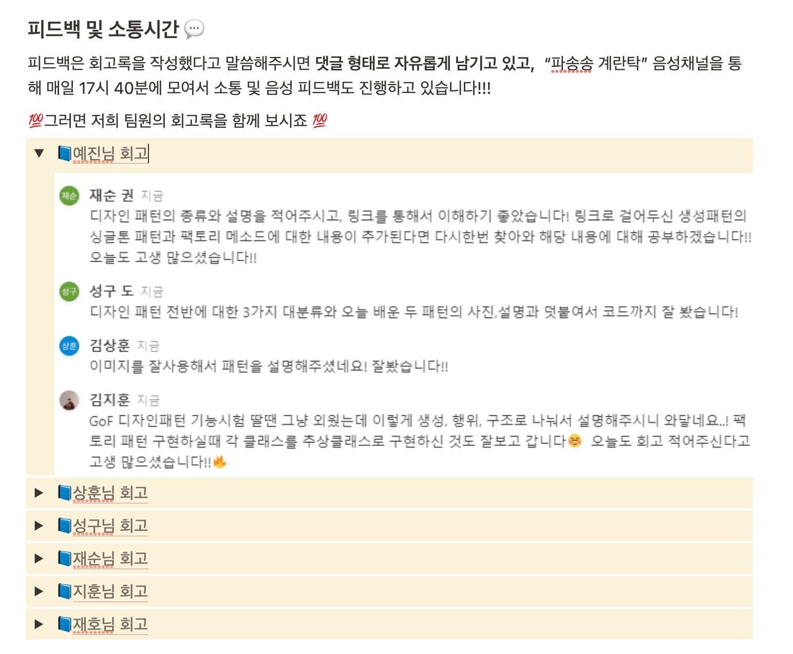 Java_11 팀은 매일 17시 40분에 디스코드 음성채널 방에 만나 회고 피드백을 진행하였다 합니다. 이렇게 고정된 시간을 상호간에 정한 것이 Java 11팀의 회고비법인 것 같습니다.