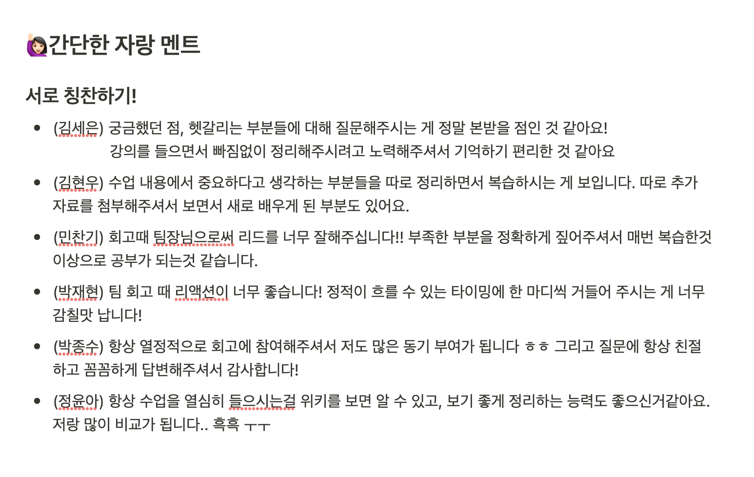 eatit 팀은 회고 시간 이후 서로에 대한 칭찬 멘트를 매일 남겨주었습니다. 서로 빠르게 친해질 수 있었 내적 친밀감을 키운 칭찬 시간이 eatit팀의 회고 비법인 듯 합니다!