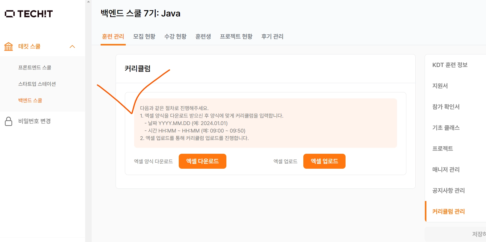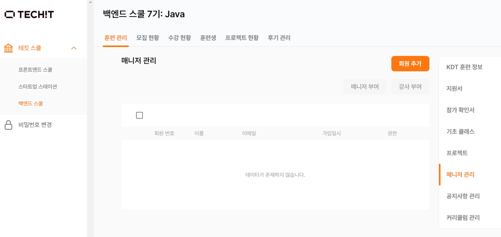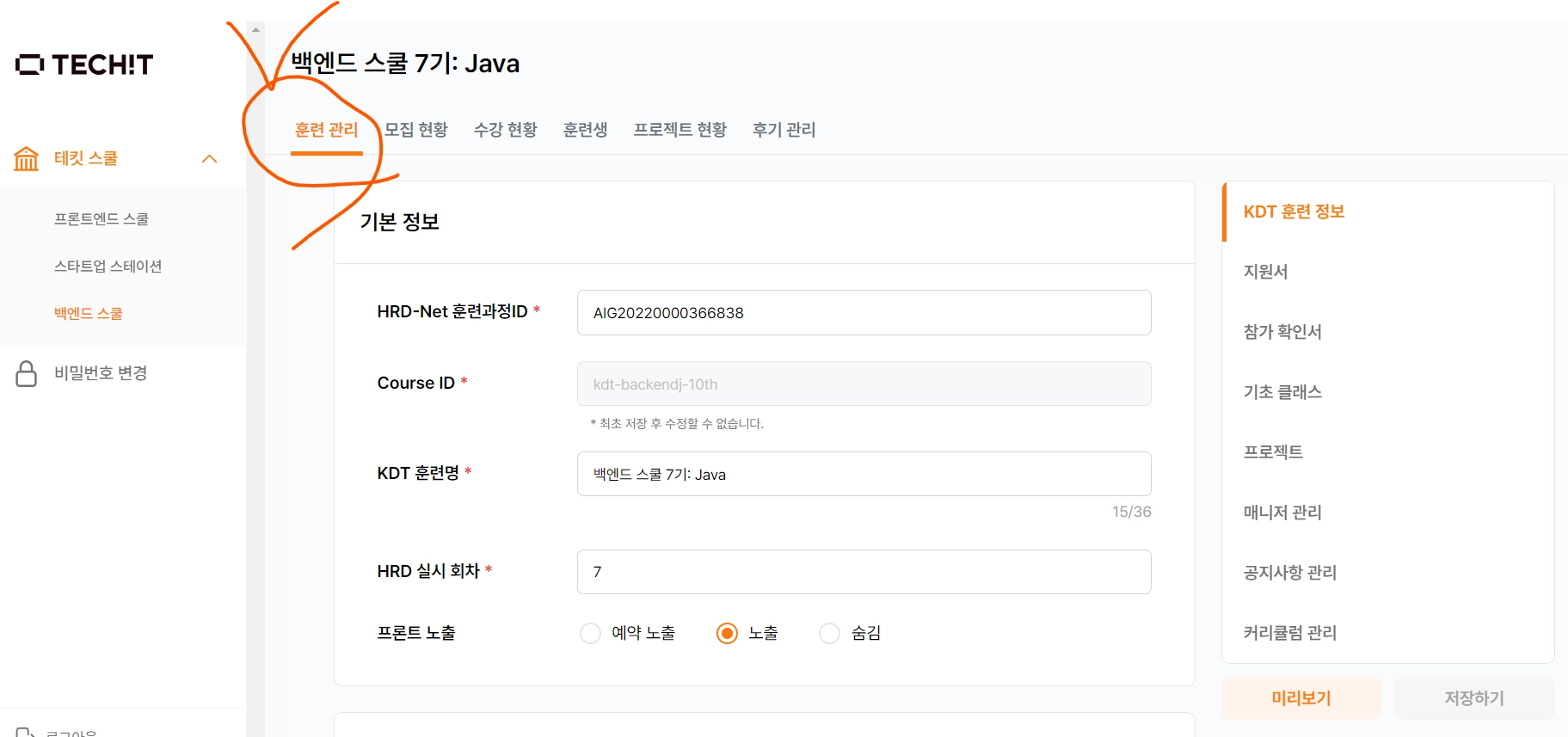 테킷 실서버 접속 ⇒ 로그인 ⇒ 백엔드 스쿨 ⇒ 담당 기수 ⇒ 훈련 관리 클릭