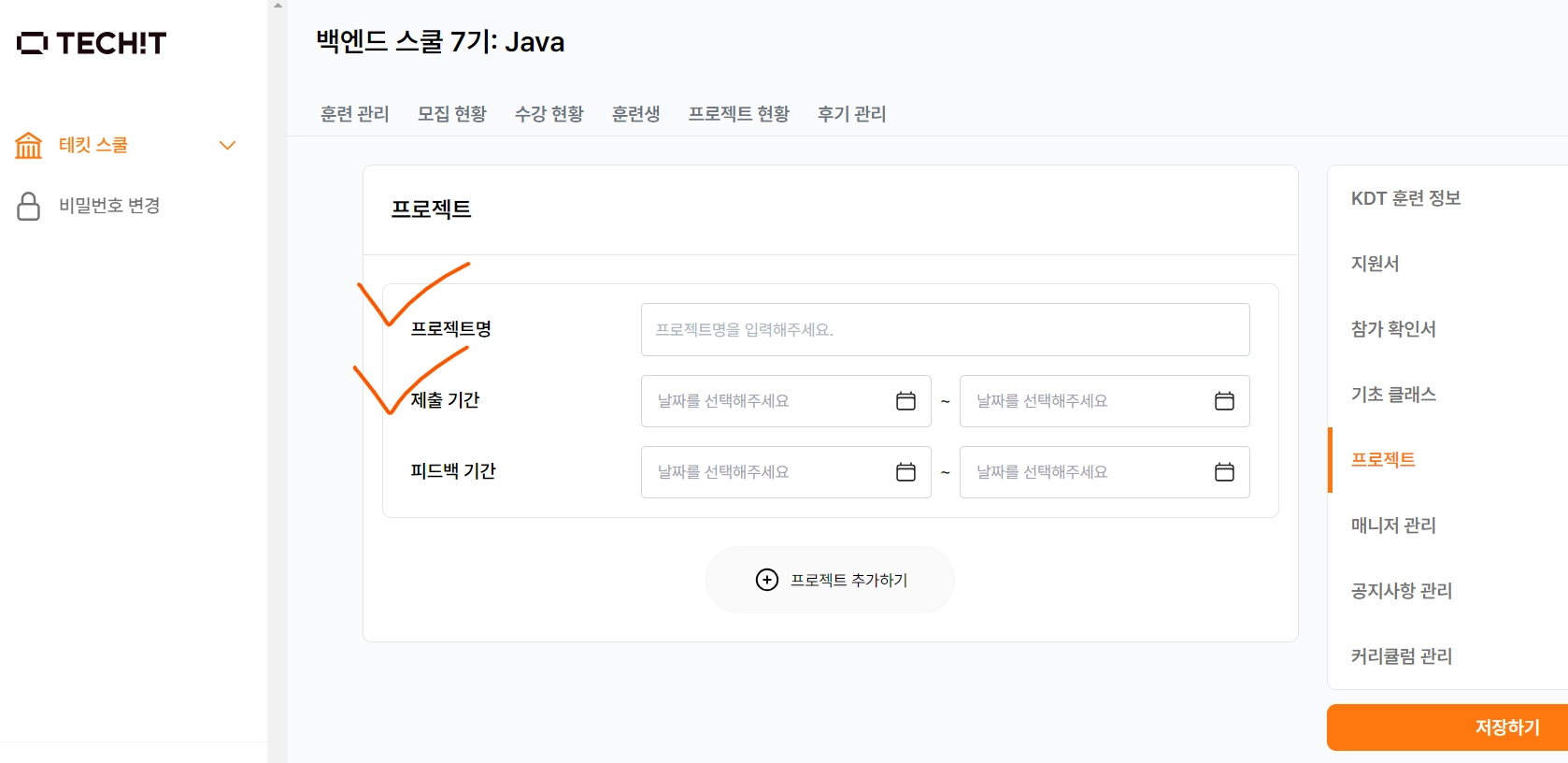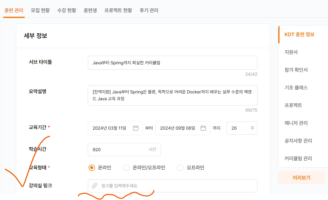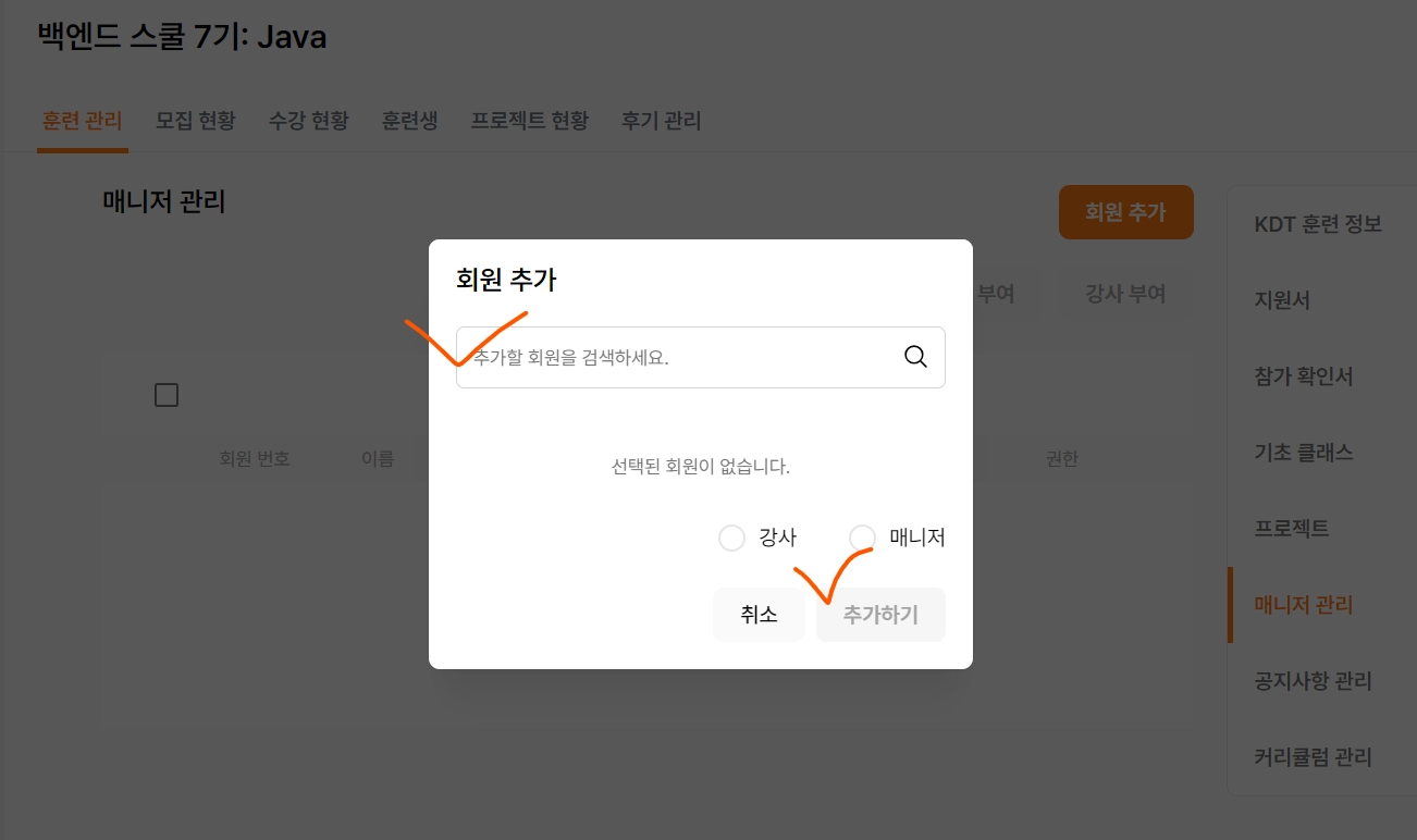 테킷 실서버 접속 ⇒ 로그인 ⇒ 백엔드 스쿨 ⇒ 담당 기수 ⇒ 훈련 관리 클릭