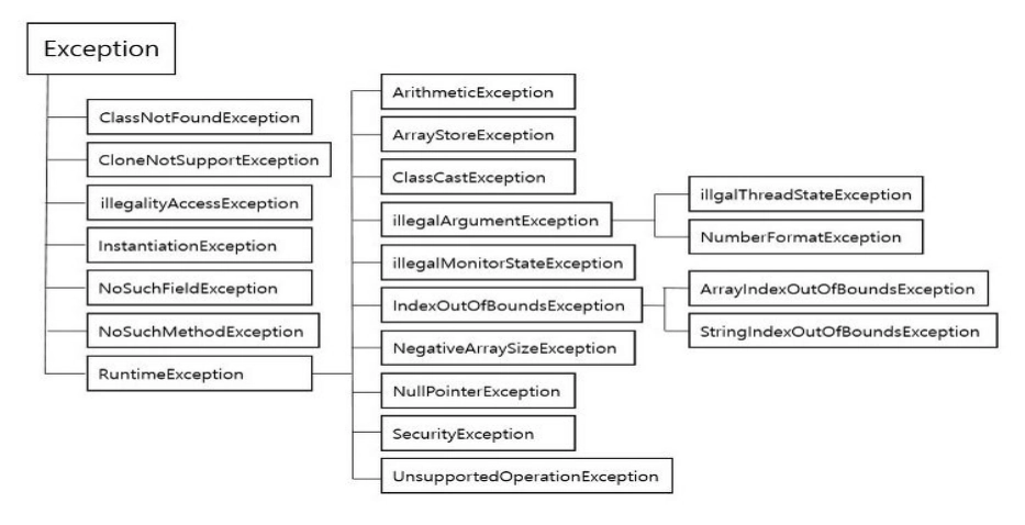 실행 예외(runtime exception) 또는 언체크 예외 (unchecked exception)