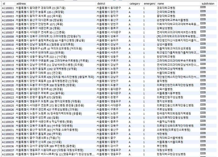 `category` VARCHAR(1) NOT NULL COMMENT '병원분류\nC의원\nE한방병원\nN치과의원\n...나중에 추가 작성\n',
