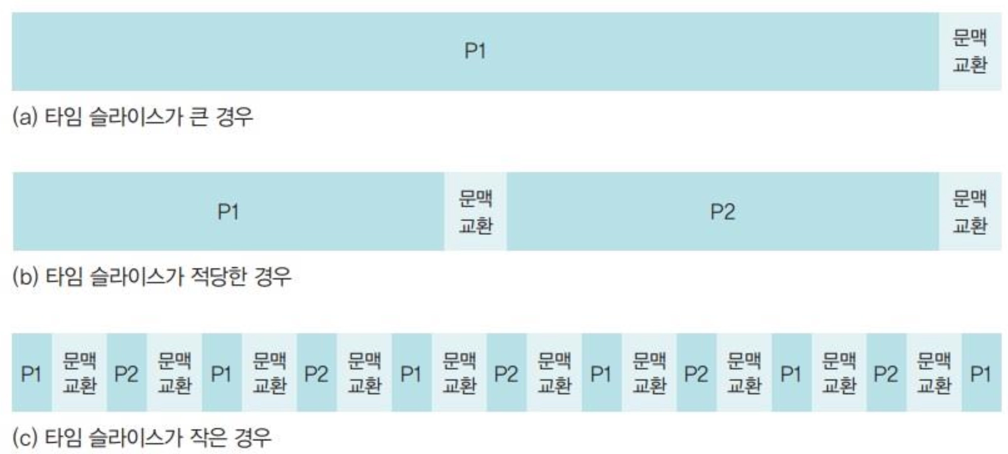 타임 슬라이스의 크기는 문맥교환이 얼마나 자주 이루어 지는 지를 결정한다. 타임 슬라이스가 작아 문맥 교환이 자주 일어나면 시간을 낭비하고 문맥 교환이 너무 크면 하나의 작업이 끝난 귀에 다음 작업이 시작되는 것처럼 보여 사용자가 불편함을 느낄 수 있다. 따라서 타임 슬라이스를 되도록 작게 설정하되 문맥 교환에 걸리는 시간을 고려해서 설정하는 것이 좋다.