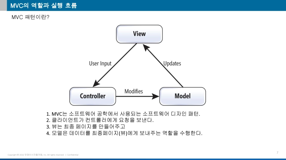 사용자가 controller를 조작하면 controller는 model을 통해서 데이터를 가져오고 그 정보를 바탕으로 시각적인 표현을 담당하는 View를 제어해서 사용자에게 전달하게 된다