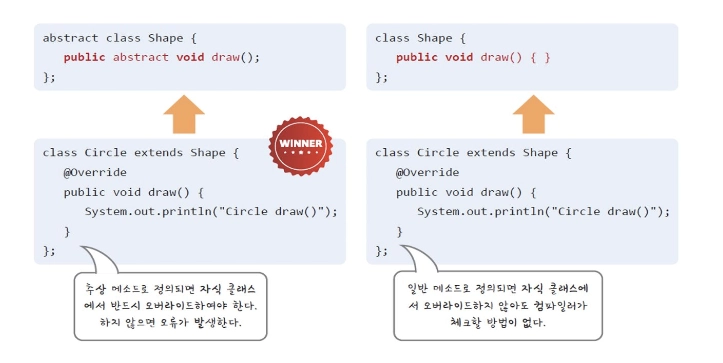 이러한 추상 클래스는 객체 지향 프로그래밍에서 중요한 특징인 다형성을 가지는 메소드의 집합을 정의할 수 있도록 하며 즉, 반드시 사용되어야 하는 메소드를 추상 클래스에 추상 메소드로 선언해 놓으면, 이 클래스를 상속받는 모든 클래스에서는 이 추상 메소드를 반드시 재정의해야 함