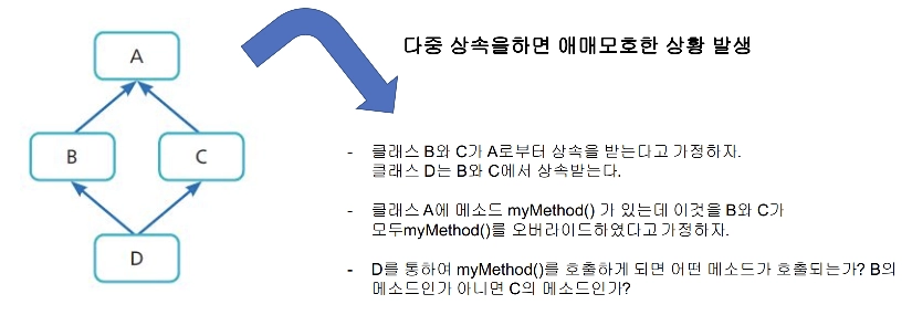 어떤 클래스가 하나 이상의 상위 클래스로부터 여러 가지 행동이나 특징을 상속 받을 수 있는 것을 의미