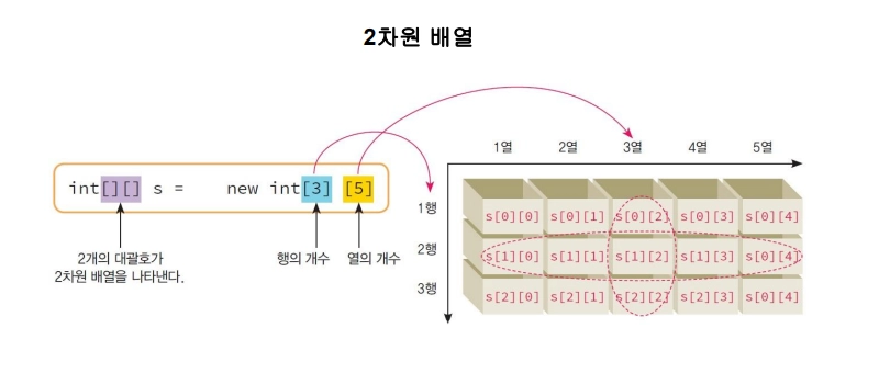 타입[][] 변수이름; | int[][] score; |