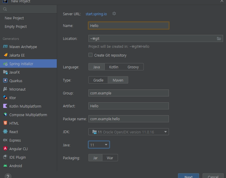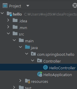 Controller 패키지를 생성하고, HelloController.java 라는 이름의 컨트롤러를 생성한다.