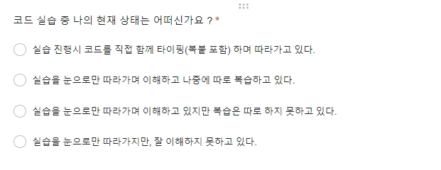 Why1 전반적인 교육 이해도가 8주차 설문(11/11) 교육이해도(3.7)에 비해 낮게 나옴