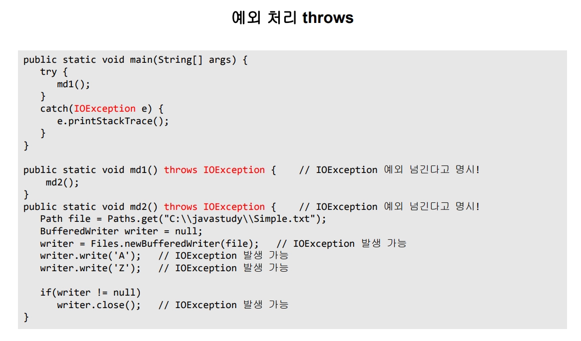 예외를 프로그래머가 직접 처리하지 않고, 호출한 함수(또는 JVM)에 맡긴다는 뜻.