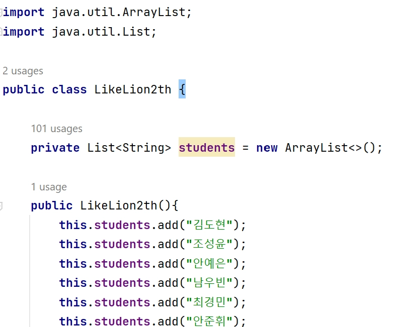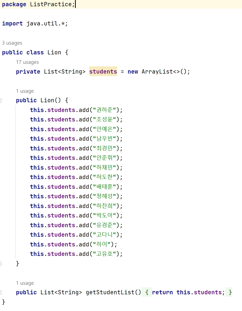 List<String> students = Lion.getStudentList(); 에서 굵은 글씨는 Lion 클래스에서 getStudentList()라는 메소드를 바로 참조하고 있는 상태입니다. 즉 인스턴스로 참조를 한 것이 아니기 때문에 static 메서드가 아닌 get~List() 메서드는 메모리에 올라가지 못하는 상황인 것입니다!