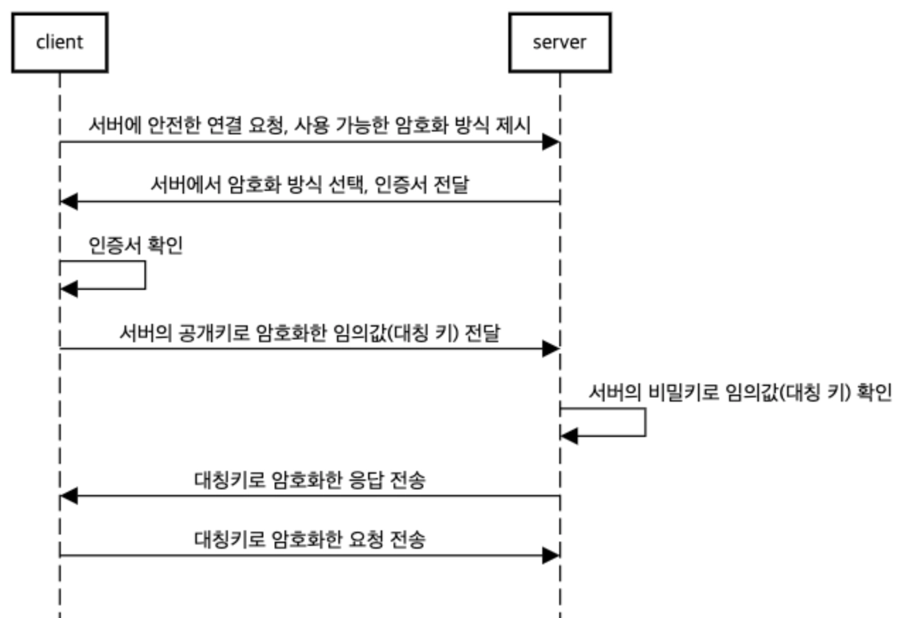 기본적인 과정은 위와 같습니다. 핵심적인 부분은, 대칭키 암호화를 하기 위한 공유되어야 되는 비밀키를, 비대칭키 암호화를 통해 공유한다는 부분입니다.