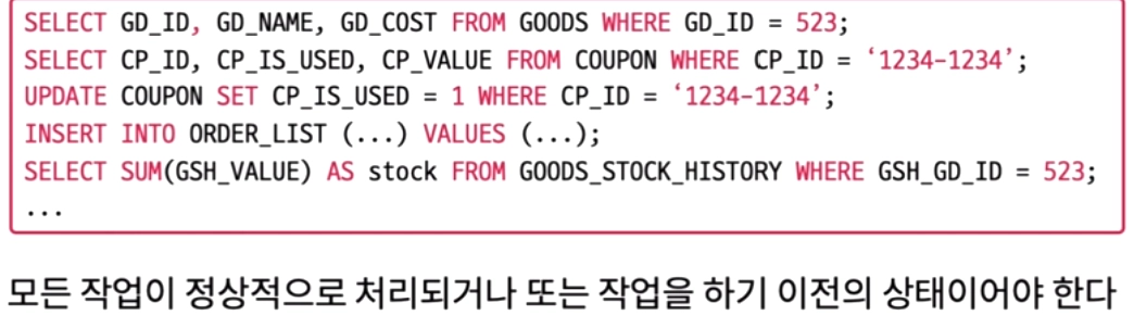 하나의 트랜잭션은 원자적 수행단위이다 = 트랜잭션의 모든 작업들은 부분만 수행될 수 없고, 완전히 수행되거나 수행되지 말아야 한다 (All or nothing)