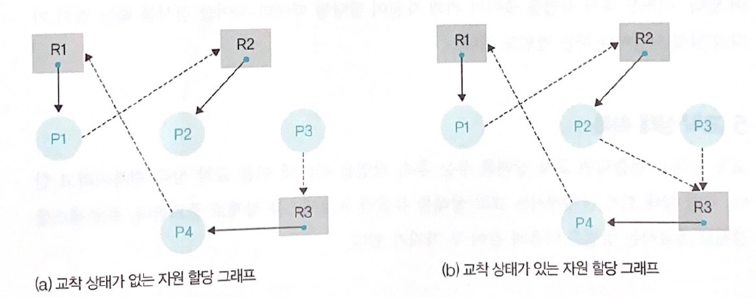 아래의 그림에선, 동시에 사용 가능한 자원의 수를 1개로 간주하고 표시했기에 오른쪽 그림은 사이클이 존재해 교착 상태 발생