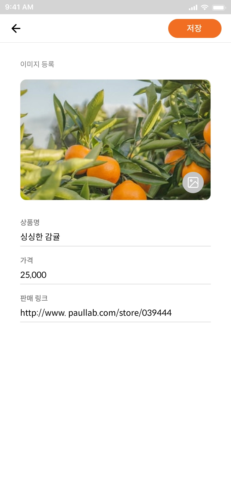 상품 이미지, 상품명, 가격, 판매링크를 입력받을 수 있으며, 모든 입력이 완료되면 저장 버튼이 활성화됩니다.