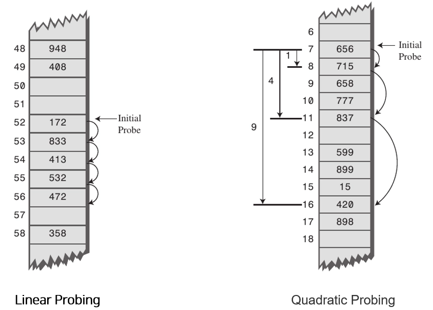 Quadratic Probing: 해시의 저장순서 폭을 제곱으로 저장하는 방식이다. 예를 들어 처음 충돌이 발생한 경우에는 1만큼 이동하고 그 다음 계속 충돌이 발생하면 2^2, 3^2 칸씩 옮기는 방식이다.