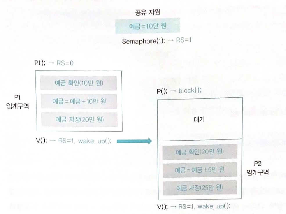 나중에 도착한 프로세스 P2는 현재 RS 값이 0이므로 프로세스 P1이 임계구역을 빠져나올 때까지 세마포어 큐에서 대기