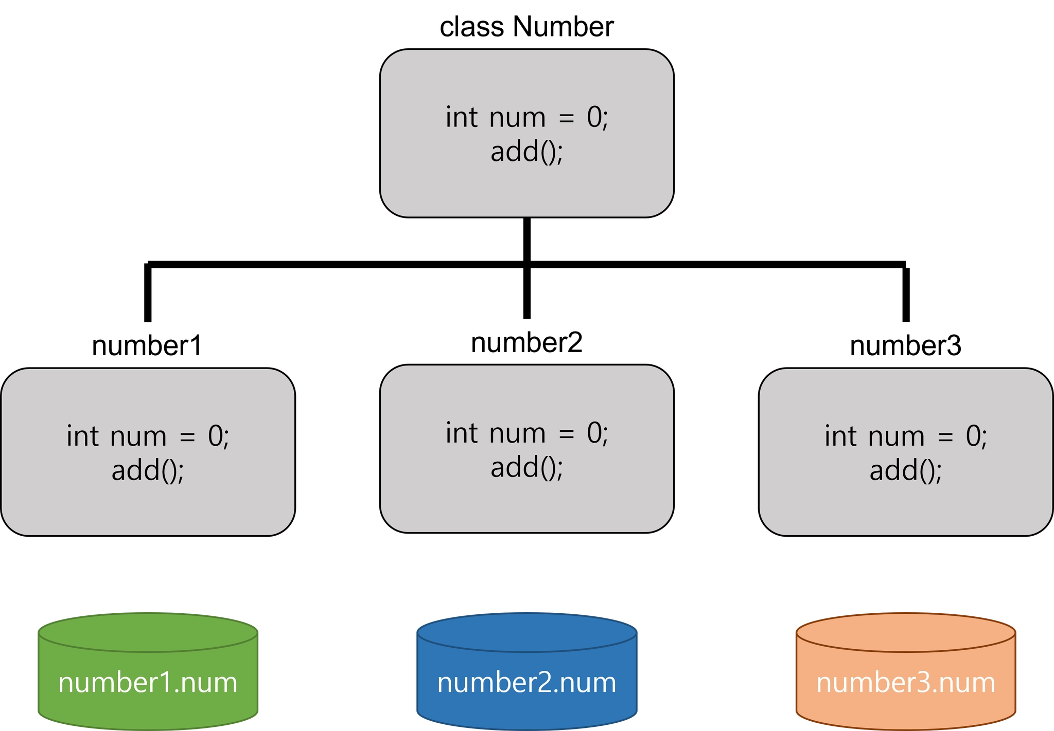 멤버 변수의 경우 각 객체마다 고유의 속성값 저장 가능