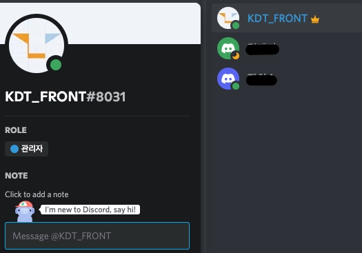 추후에도 메세지를 주고 받기를 원하신다면 우측의 디스코드 아이콘 클릭시 계속 이어서 메세지가 가능합니다. 원하는 프로필을 눌러 DM을 진행하세요.