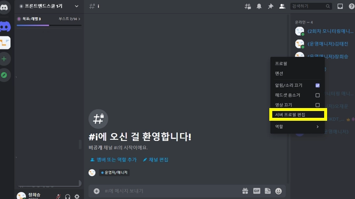 서버 입장 시 서버 내의 이름(별명) 변경 방법에 대해 안내 드립니다