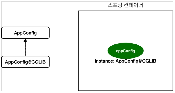 CGLIB라는 바이트코드 조작 라이브러리를 사용해서 Appconfig 클래스를 상속한 임의의 다른 클래스를 만든 뒤, 그 클래스를 빈으로 등록한다.