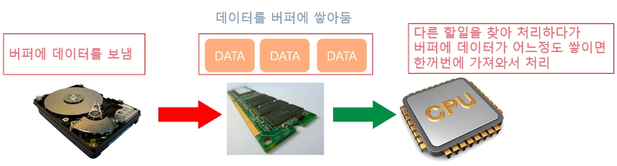 그리고 그 램은 버퍼에 데이터를 쌓아두다가 버퍼가 어느정도 쌓이면 cpu는 버퍼의 데이터를 가져와서 한꺼번에 처리한다