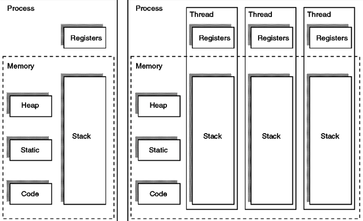 스레드별로 자신만의 스택과 레지스터 : 스택을 독립적으로 할당하는 이유? →스택 메모리 공간이 독립적이라는 것은 독립적인 함수 호출이 가능하다는 것 → 독립적인 실행 흐름이 가능