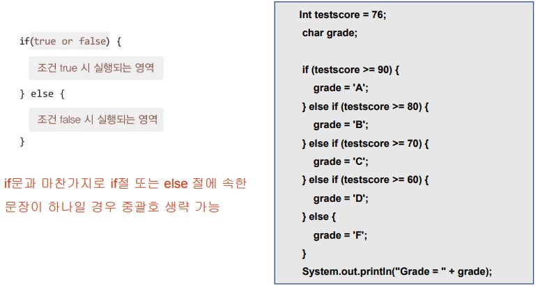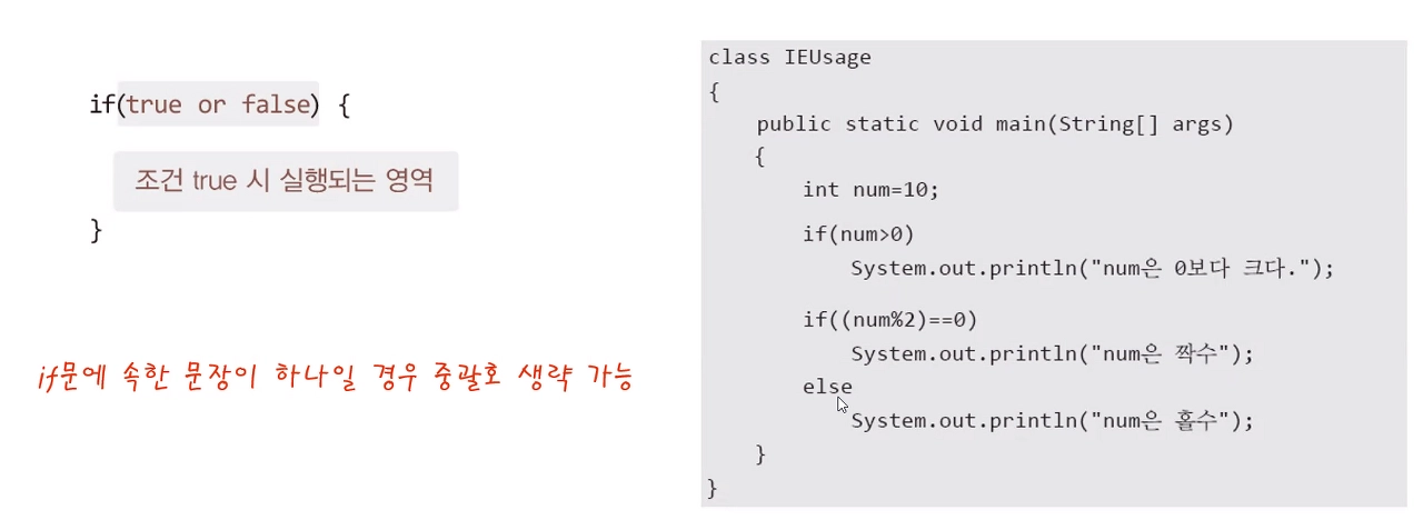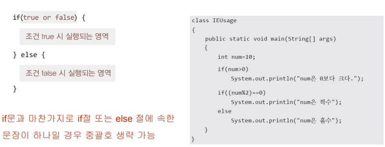 if(조건식){…} else{…} 조건식이 true가 되면 if 중괄호 내부를 실행, false가 되면 else 중괄호 내부 실행