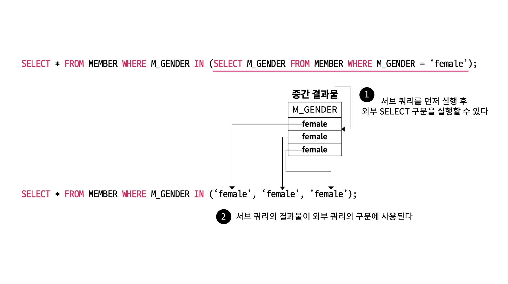 서브쿼리의 결과물을 외부 구문 필터링 값으로 사용한다.