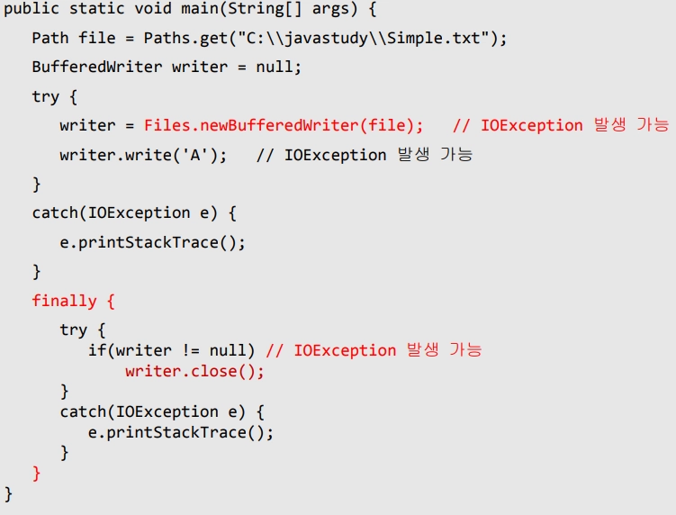 writer = Files.newBufferedWritter(file) 에서도 예외처리가 강제적으로 필요함을 알 수 있다.