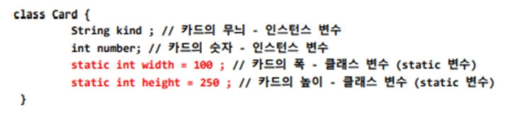 게임에서의 카드는 모두 높이, 너비 길이가 같다. 만약 배열로 52개의 카드를 생성하게 되었을 때, width 와 height이 static 변수가 아니었다면 객체의 인스턴스 변수로 생성되며 메모리 낭비가 일어난다. 이럴 때 width 와 height를 static 변수로 사용해서 값을 공유하면 메모리를 아낄 수 있다.