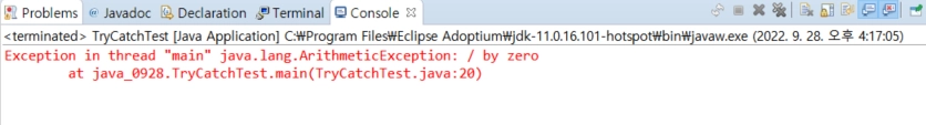 TryCatchTest.java 파일에서 20 Line이라는 문제가 발생한 지점에 대한 정보도 전달한다.