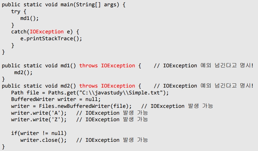 md1 함수는 IOException을 넘기겠다고 thows 키워드를 통해 명시했으며