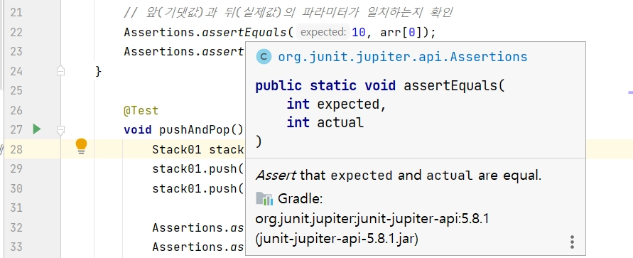 2-1. Assertion 클래스의 assertEquals 메소드는 기댓값과 실제값의 인자를 받아서 두 파라미터가 일치하는지 확인하는 기능을 한다.