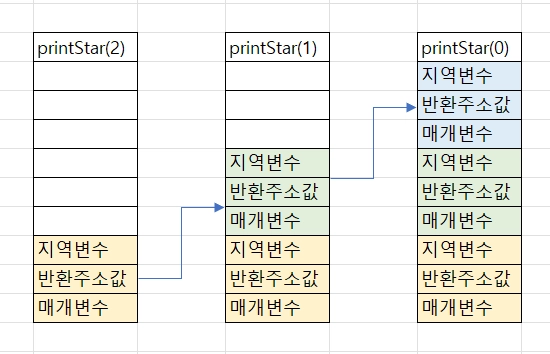 함수를 호출할 때마다 콜스택에는 함수의 매개변수, 지역변수, 반환주소값등을 모두 저장하게 된다.