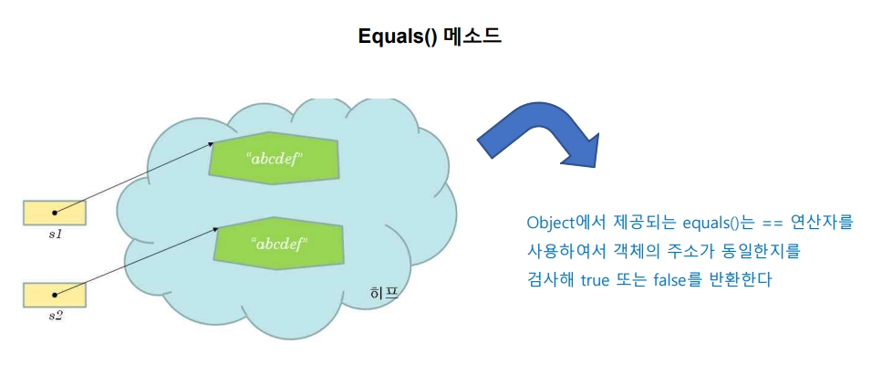 public boolean equals(Object obj) : obj가 이 객체와 같은지를 검사한다.