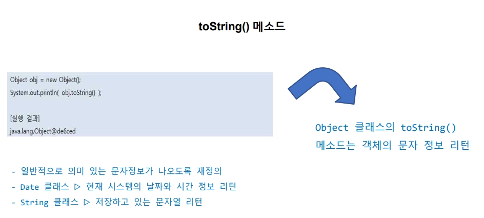 public String toString() : 객체의 문자열 표현을 반환한다.