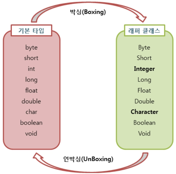 언박싱 : 래퍼클래스의 인스턴스에 저장된 값 → 기본타입의 데이터로 꺼냄